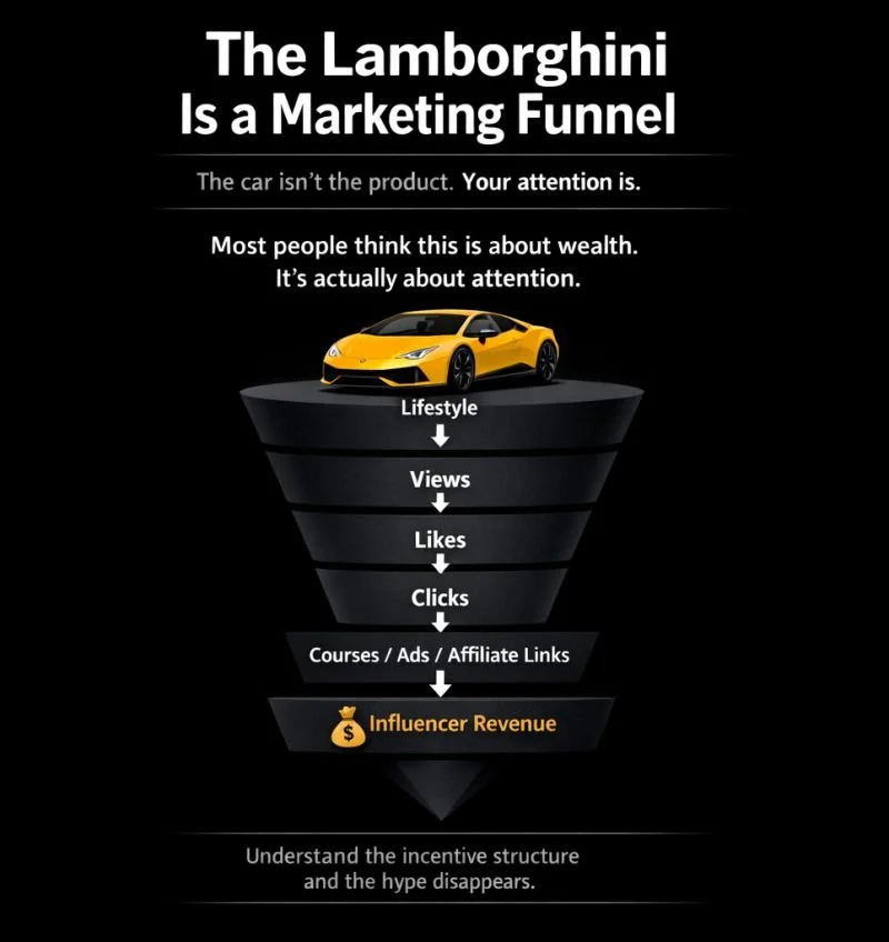 The influencer showing you the Lambo is rarely wealthy because of investing discipline. He’s wealthy because you clicked.